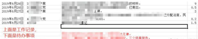 此外,工作記錄表還可以作為待辦事項來使用。當律師需要給自己安排一項將來需要完成的任務時,只需在工作記錄表將來時間的空白處記下該任務,提醒自己需要完成。