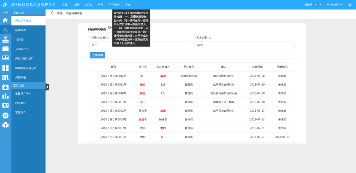 并且我們可以在系統(tǒng)里面設(shè)置委托人成對(duì)方當(dāng)事人審查是否沖突。