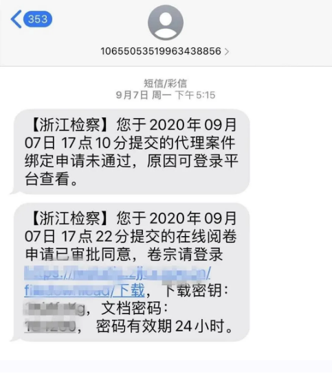 案件承辦檢察機關受理申請后,律師會收到浙江檢察APP平臺發來的服務已辦理的短信提醒,在互聯網電腦上打開短信預留的鏈接地址,經掃碼、動態人臉核驗通過后,即可下載代理案件的電子卷宗。申請通過后,須在24小時內進行下載。